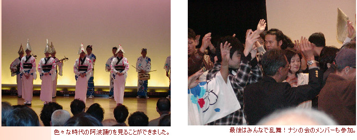 期待のかぶり物、今年は阿波踊りバージョンです。板東さんの男踊りを先頭に、すらりと伸びた清さんのきれいな女踊りが続きます。Feさんや皆の掛け声に、一往復では物足りず、二往復も‥誰かとめて(爆)