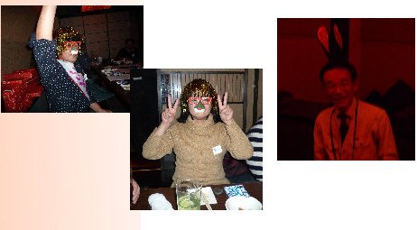 nt「そうですね・・・今年も忘年会での余興を!是非!ということで、おだてられて、やってみたのですが、人数も多くなり、はたして皆さんを楽しませることができたかどうかは疑問です。一年前から、準備していたのですが、悩みに悩んで、結局出来たのは、二日前でした。昨年同様、みんなに分かりやすくをコンセプトに、紙に大きく字をプリントしてセリフを読む形式にしましたが、これは好評だったようです。また、忘年会の席ということで、許してもらえるんじゃないかと思い、しょうもないことも書いてみたんですが、皆さんの失笑を買ったようです。トホホ・・・・来年は、誰か一緒にやってね!」